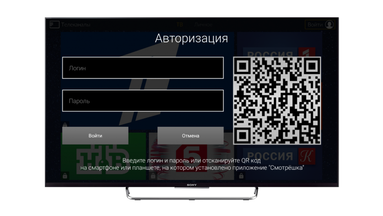 Введите логин и пароль с помощью пульта и виртуальной клавиатуры, нажмите «Войти».