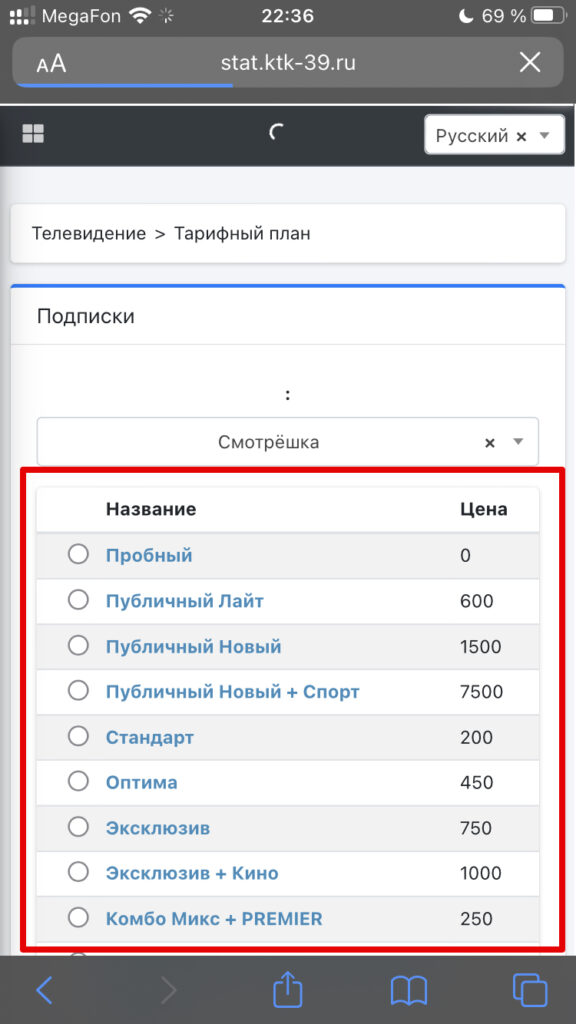 У вас загрузился список тарифных планов, с ценой, которые мы можем вам предложить